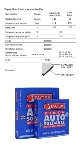 La cinta Autosoldable TACSA se debe aplicar elongando como mínimo a ¾ de su ancho original, en capas sucesivas con 50% de solapamiento hasta alcanzar la acumulación deseada. Se deben evitar burbujas y atrapamiento de aire. En áreas críticas, con irregularidades y desniveles, la cinta debe elongarse hasta casi el punto de ruptura; hacerlo no alterará sus propiedades físicas o eléctricas, esto permitirá un mayor amoldamiento sobre la superficie. En áreas menos críticas, se puede usar menos elongación.